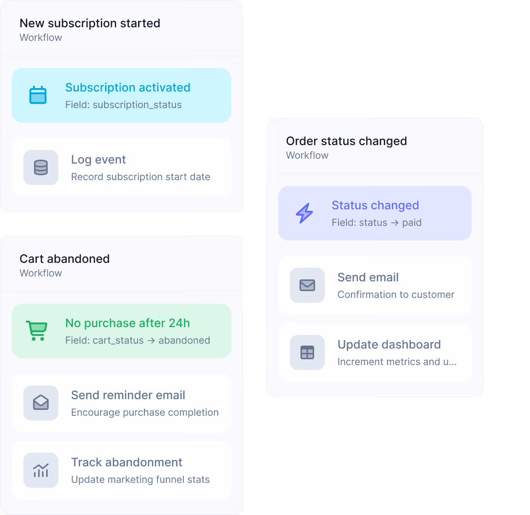 Comprehensive Frontend and Backend workflows that run in the right context. Design approval chains, data pipelines, and integrations with a drag-and-drop canvas that bridges UI interactions and server automation.