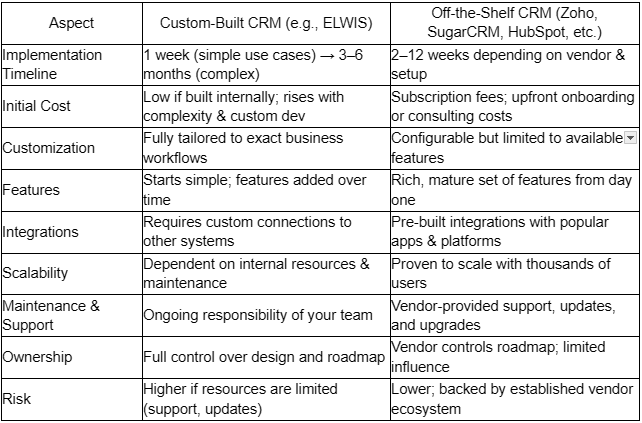 ELWIS is faster for prototypes and internal tools. Zoho, SugarCRM, and HubSpot shine with pre-built features, integrations, and proven scalability.