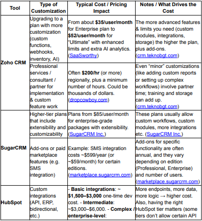 Real-world Customization Costs for Zoho, SugarCRM, HubSpot